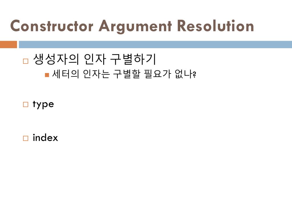Constructor Argument Resolution • 생성자의 인자 구별하기 • 세터의 인자는 구별할 필요가 없나? • type • index