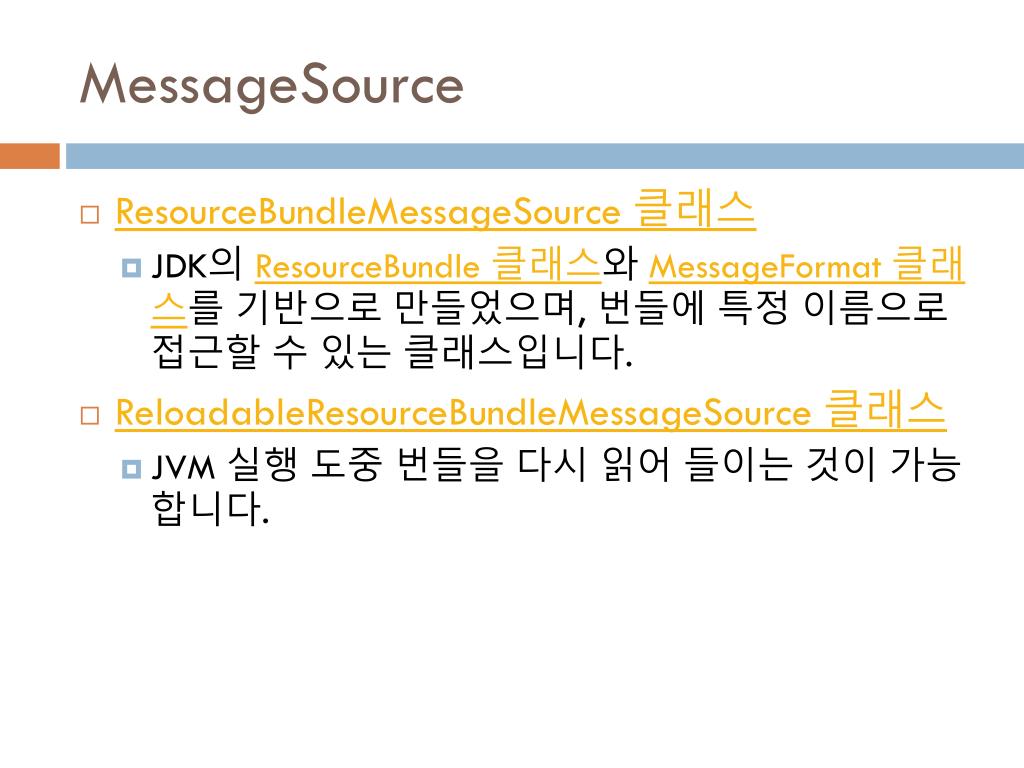 MessageSource • ResourceBundleMessageSource 클래스 • JDK의 ResourceBundle 클래스와 MessageFormat 클래스를 기반으로 만들었으며, 번들에 특정 이름으로 접근할 수 있는 클래스입니다. • ReloadableResourceBundleMessageSource 클래스 • JVM 실행 도중 번들을 다시 읽어 들이는 것이 가능합니다.