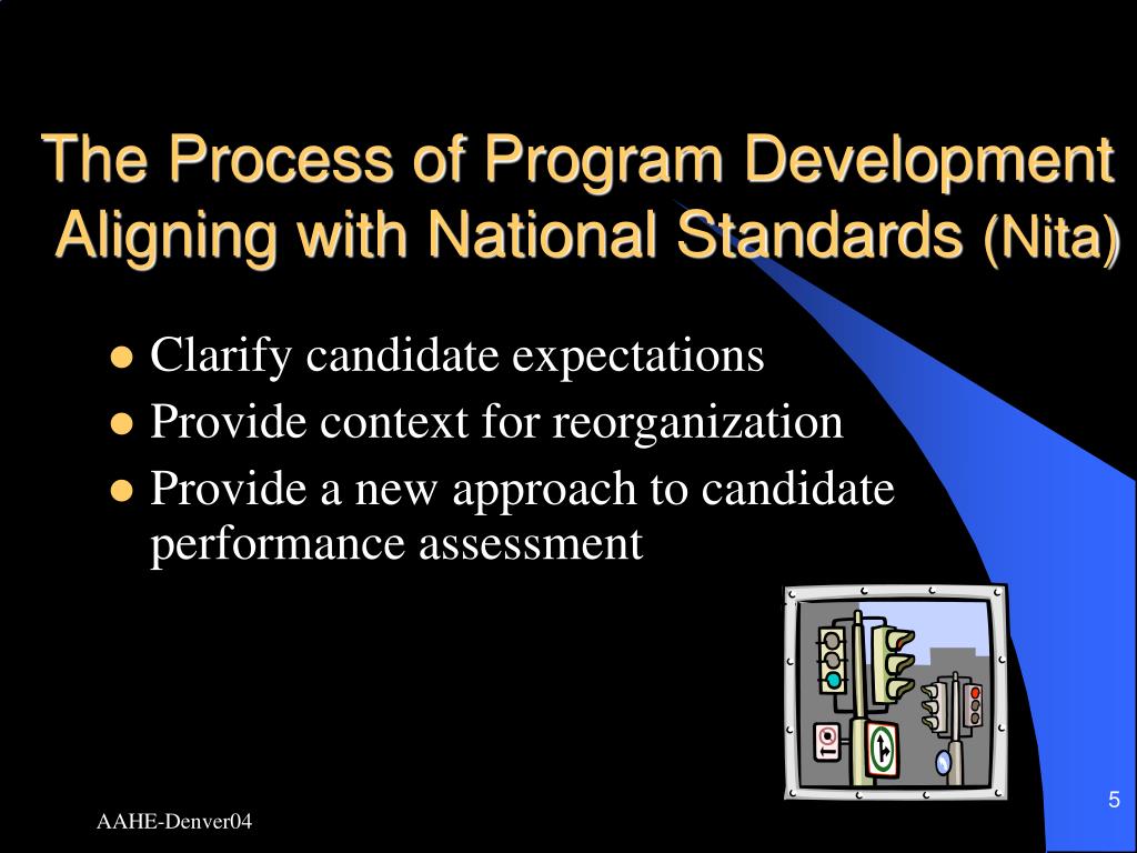 The Process of Program Development Aligning with National Standards (Nita) • Clarify candidate expectations • Provide context for reorganization • Provide a new approach to candidate performance assessment AAHE-Denver04