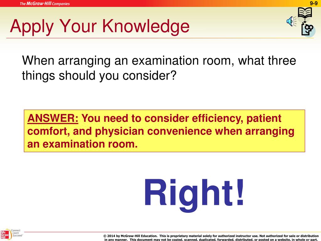 Apply Your Knowledge When arranging an examination room, what three things should you consider? ANSWER:You need to consider efficiency, patient comfort, and physician convenience when arranging an examination room. Right!