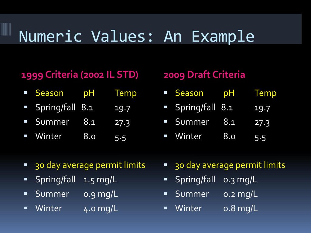 Numeric Values: An Example 1999 Criteria (2002 IL STD) 2009 Draft Criteria • Season pH Temp • Spring/fall 8.1 19.7 • Summer 8.1 27.3 • Winter 8.0 5.5 • 30 day average permit limits • Spring/fall 1.5 mg/L • Summer 0.9 mg/L • Winter 4.0 mg/L • Season pH Temp • Spring/fall 8.1 19.7 • Summer 8.1 27.3 • Winter 8.0 5.5 • 30 day average permit limits • Spring/fall 0.3 mg/L • Summer 0.2 mg/L • Winter 0.8 mg/L