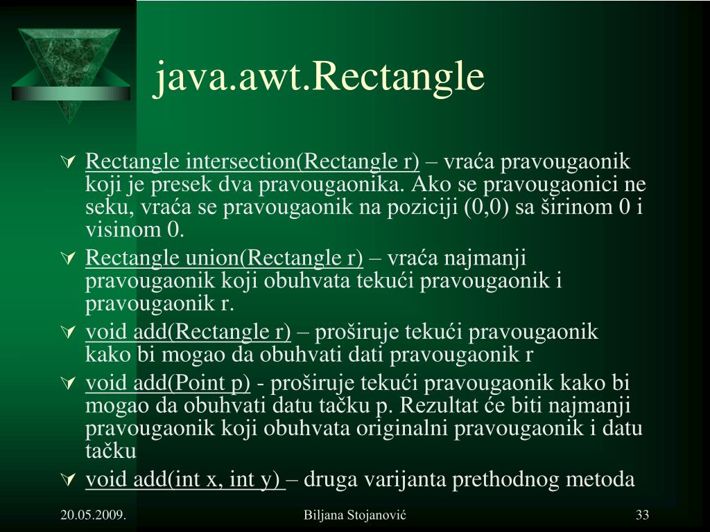 java.awt.Rectangle • Rectangle intersection(Rectangle r) – vraća pravougaonik koji je presek dva pravougaonika. Ako se pravougaonici ne seku, vraća se pravougaonik na poziciji (0,0) sa širinom 0 i visinom 0. • Rectangle union(Rectangle r) – vraća najmanji pravougaonik koji obuhvata tekući pravougaonik i pravougaonik r. • void add(Rectangle r) – proširuje tekući pravougaonik kako bi mogao da obuhvati dati pravougaonik r • void add(Point p) - proširuje tekući pravougaonik kako bi mogao da obuhvati datu tačku p. Rezultat će biti najmanji pravougaonik koji obuhvata originalni pravougaonik i datu tačku • void add(int x, int y) – druga varijanta prethodnog metoda Biljana Stojanović