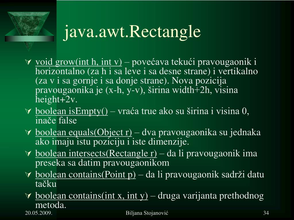 java.awt.Rectangle • void grow(int h, int v) – povećava tekući pravougaonik i horizontalno (za h i sa leve i sa desne strane) i vertikalno (za v i sa gornje i sa donje strane). Nova pozicija pravougaonika je (x-h, y-v), širina width+2h, visina height+2v. • boolean isEmpty() – vraća true ako su širina i visina 0, inače false • boolean equals(Object r) – dva pravougaonika su jednaka ako imaju istu poziciju i iste dimenzije. • boolean intersects(Rectangle r) – da li pravougaonik ima preseka sa datim pravougaonikom • boolean contains(Point p) – da li pravougaonik sadrži datu tačku • boolean contains(int x, int y) – druga varijanta prethodnog metoda. Biljana Stojanović