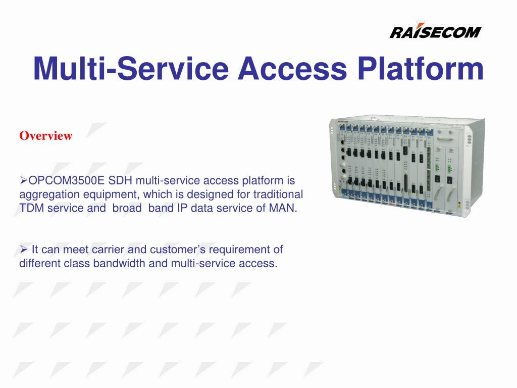 Multi-Service Access Platform Overview • OPCOM3500E SDH multi-service access platform is aggregation equipment, which is designed for traditional TDM service and broad band IP data service of MAN. • It can meet carrier and customer’s requirement of different class bandwidth and multi-service access.