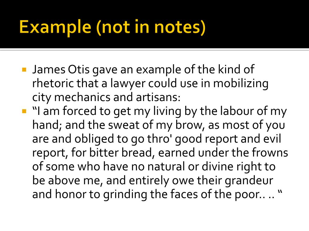 Example (not in notes) • James Otisgave an example of the kind of rhetoric that a lawyer could use in mobilizing city mechanics and artisans: • “I am forced to get my living by the labour of my hand; and the sweat of my brow, as most of you are and obliged to go thro' good report and evil report, for bitter bread, earned under the frowns of some who have no natural or divine right to be above me, and entirely owe their grandeur and honor to grinding the faces of the poor.. .. “