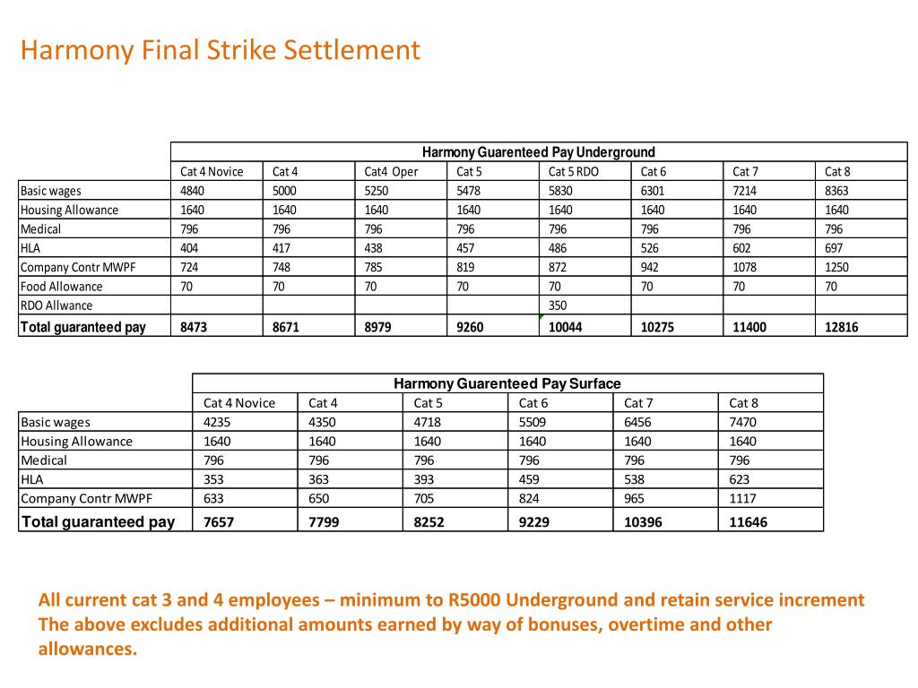 Harmony Final Strike Settlement All current cat 3 and 4 employees – minimum to R5000 Underground and retain service increment The above excludes additional amounts earned by way of bonuses, overtime and other allowances.