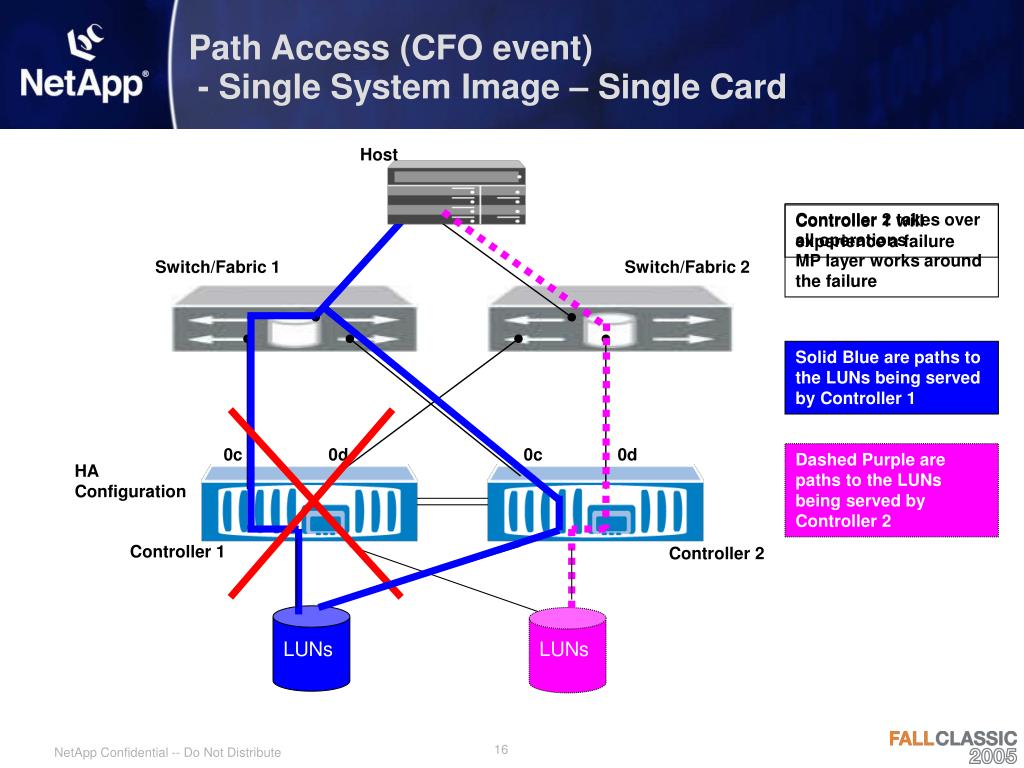 Path Access (CFO event) - Single System Image – Single Card 0c 0d 0c 0d HA Configuration Controller 1 Controller 2 Host Controller 2 takes over all operations MP layer works around the failure Controller 1 will experience a failure Switch/Fabric 1 Switch/Fabric 2 Solid Blue are paths to the LUNs being served by Controller 1 Dashed Purple are paths to the LUNs being served by Controller 2 LUNs LUNs
