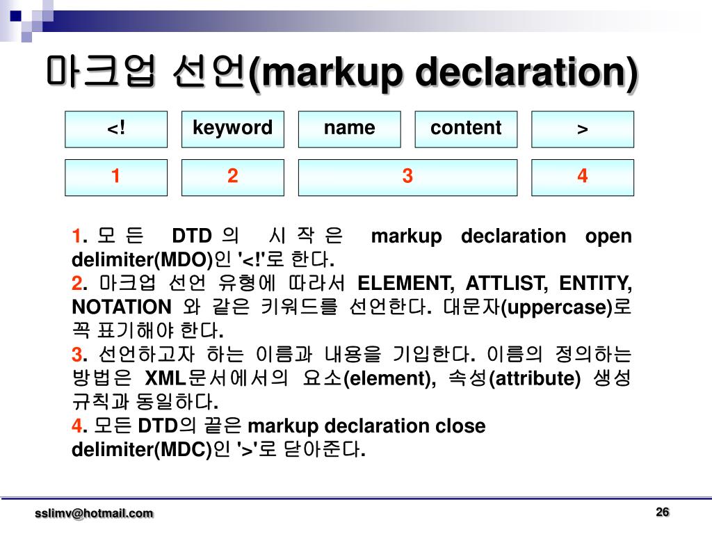 <! keyword name content > 1 2 3 4 마크업 선언(markup declaration) 1.모든 DTD의 시작은 markup declaration open delimiter(MDO)인 '<!'로 한다. 2. 마크업 선언 유형에 따라서 ELEMENT, ATTLIST, ENTITY, NOTATION 와 같은 키워드를 선언한다. 대문자(uppercase)로 꼭 표기해야 한다. 3. 선언하고자 하는 이름과 내용을 기입한다. 이름의 정의하는 방법은 XML문서에서의 요소(element), 속성(attribute) 생성 규칙과 동일하다. 4. 모든 DTD의 끝은 markup declaration close delimiter(MDC)인 '>'로 닫아준다.