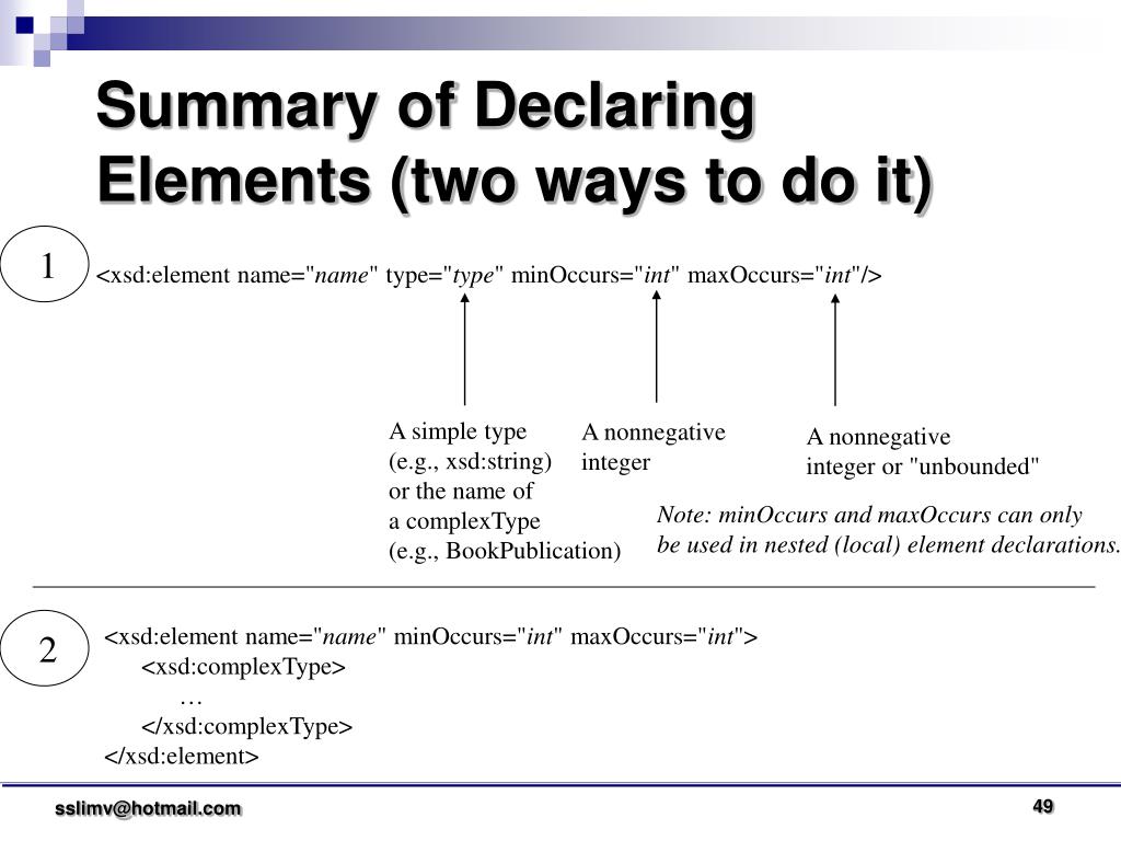 Summary of Declaring Elements (two ways to do it) 1 <xsd:element name="name" type="type" minOccurs="int" maxOccurs="int"/> A simple type (e.g., xsd:string) or the name of a complexType (e.g., BookPublication) A nonnegative integer A nonnegative integer or "unbounded" Note: minOccurs and maxOccurs can only be used in nested (local) element declarations. <xsd:element name="name" minOccurs="int" maxOccurs="int"> <xsd:complexType> … </xsd:complexType> </xsd:element> 2