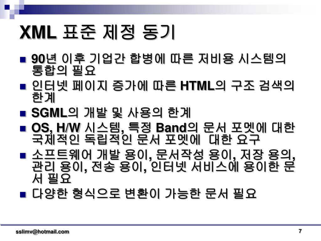 XML 표준 제정 동기 • 90년 이후 기업간 합병에 따른 저비용 시스템의 통합의 필요 • 인터넷 페이지 증가에 따른 HTML의 구조 검색의 한계 • SGML의 개발 및 사용의 한계 • OS, H/W 시스템, 특정 Band의 문서 포멧에 대한 국제적인 독립적인 문서 포멧에 대한 요구 • 소프트웨어 개발 용이, 문서작성 용이, 저장 용의, 관리 용이, 전송 용이, 인터넷 서비스에 용이한 문서 필요 • 다양한 형식으로 변환이 가능한 문서 필요