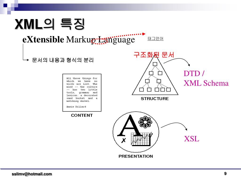 Layout View Logical View 형식(Style) 내용(Content) + Data로서 의미를 지님 다양한 사용자 뷰(View)제공 XML의 특징 “XML is a breakthrough technology” - Bill Gates -