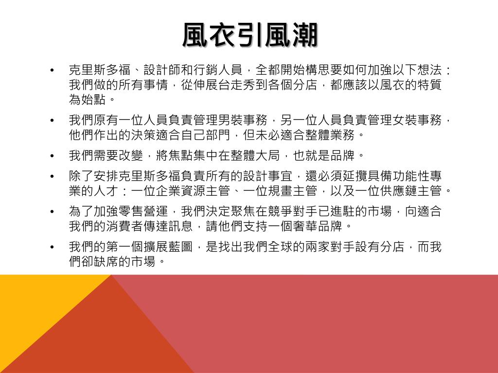 風衣引風潮 • 克里斯多福、設計師和行銷人員,全都開始構思要如何加強以下想法:我們做的所有事情,從伸展台走秀到各個分店,都應該以風衣的特質為始點。 • 我們原有一位人員負責管理男裝事務,另一位人員負責管理女裝事務,他們作出的決策適合自己部門,但未必適合整體業務。 • 我們需要改變,將焦點集中在整體大局,也就是品牌。 • 除了安排克里斯多福負責所有的設計事宜,還必須延攬具備功能性專業的人才:一位企業資源主管、一位規畫主管,以及一位供應鏈主管。 • 為了加強零售營運,我們決定聚焦在競爭對手已進駐的市場,向適合我們的消費者傳達訊息,請他們支持一個奢華品牌。 • 我們的第一個擴展藍圖,是找出我們全球的兩家對手設有分店,而我們卻缺席的市場。