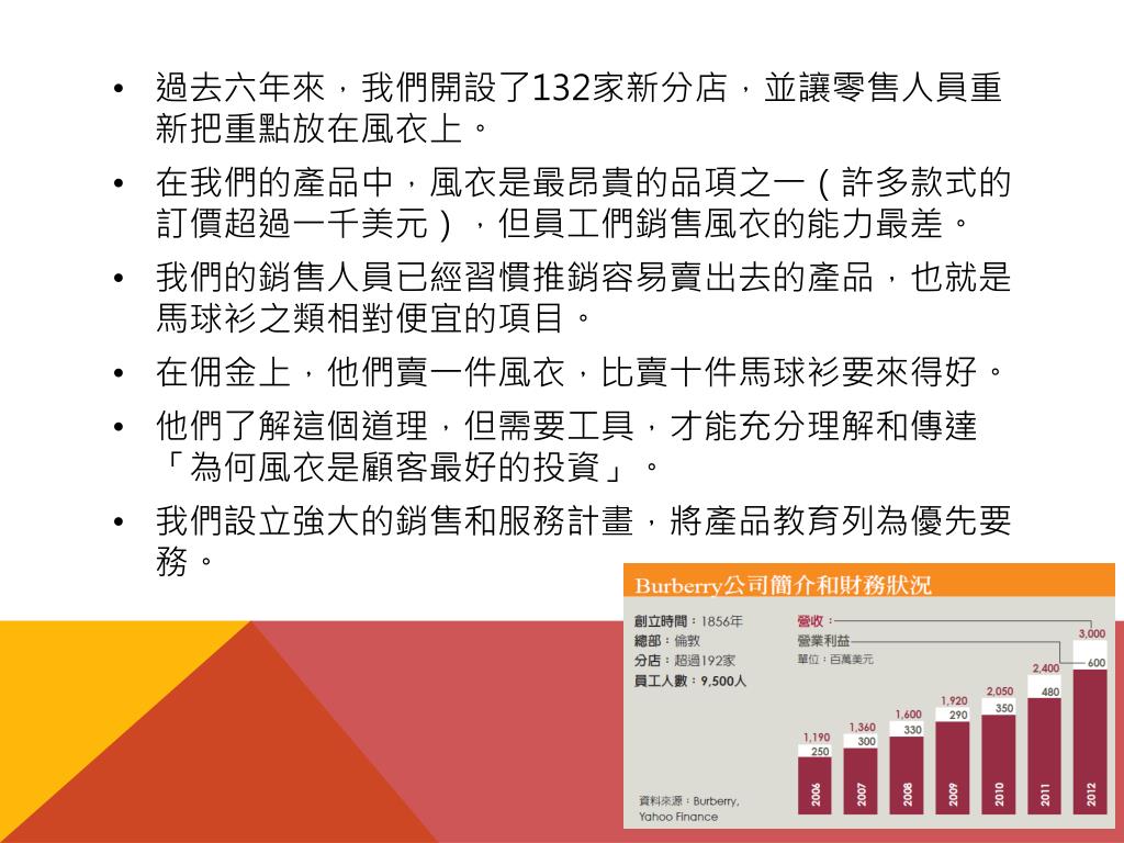過去六年來,我們開設了132家新分店,並讓零售人員重新把重點放在風衣上。過去六年來,我們開設了132家新分店,並讓零售人員重新把重點放在風衣上。 • 在我們的產品中,風衣是最昂貴的品項之一(許多款式的訂價超過一千美元),但員工們銷售風衣的能力最差。 • 我們的銷售人員已經習慣推銷容易賣出去的產品,也就是馬球衫之類相對便宜的項目。 • 在佣金上,他們賣一件風衣,比賣十件馬球衫要來得好。 • 他們了解這個道理,但需要工具,才能充分理解和傳達「為何風衣是顧客最好的投資」。 • 我們設立強大的銷售和服務計畫,將產品教育列為優先要務。