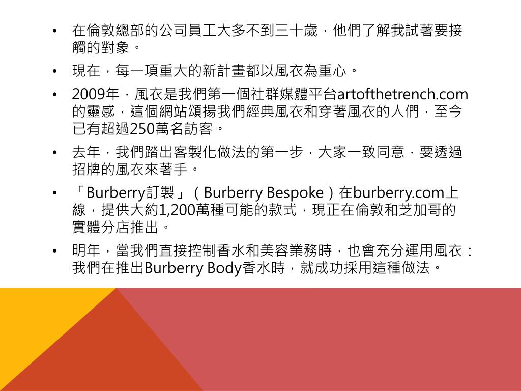 在倫敦總部的公司員工大多不到三十歲,他們了解我試著要接觸的對象。在倫敦總部的公司員工大多不到三十歲,他們了解我試著要接觸的對象。 • 現在,每一項重大的新計畫都以風衣為重心。 • 2009年,風衣是我們第一個社群媒體平台artofthetrench.com的靈感,這個網站頌揚我們經典風衣和穿著風衣的人們,至今已有超過250萬名訪客。 • 去年,我們踏出客製化做法的第一步,大家一致同意,要透過招牌的風衣來著手。 • 「Burberry訂製」(Burberry Bespoke)在burberry.com上線,提供大約1,200萬種可能的款式,現正在倫敦和芝加哥的實體分店推出。 • 明年,當我們直接控制香水和美容業務時,也會充分運用風衣:我們在推出Burberry Body香水時,就成功採用這種做法。