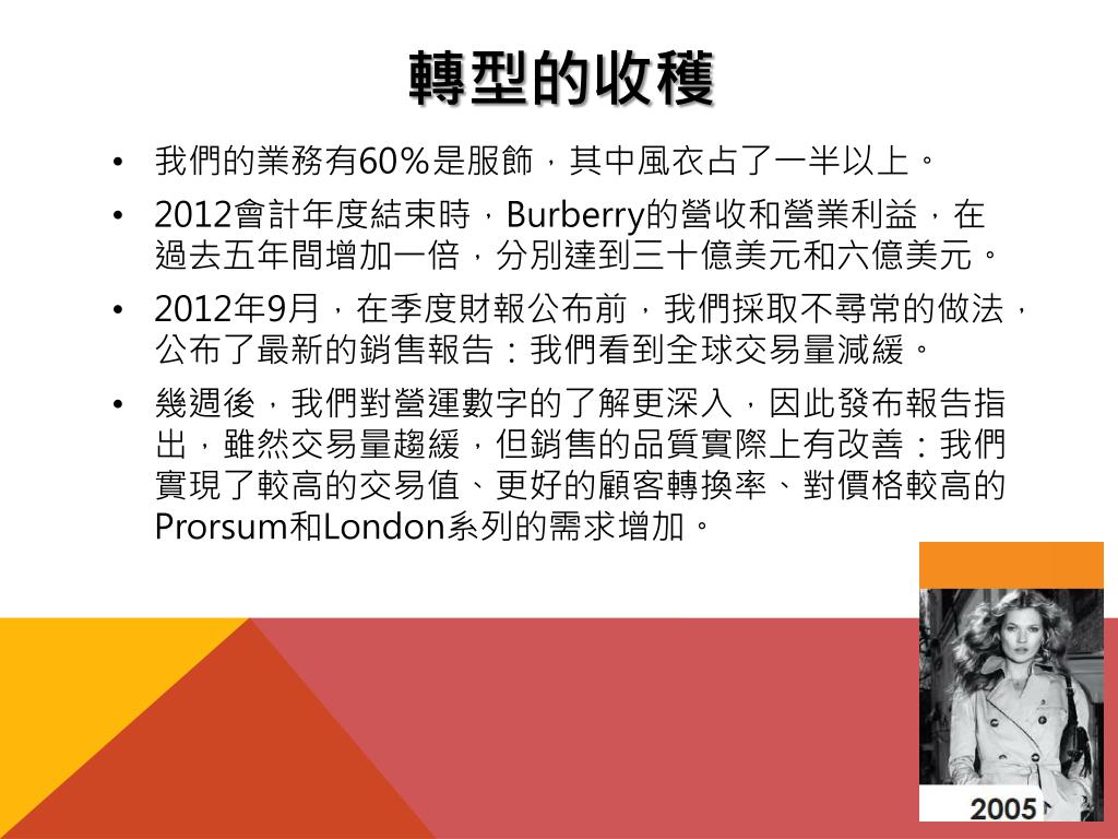 轉型的收穫 • 我們的業務有60%是服飾,其中風衣占了一半以上。 • 2012會計年度結束時,Burberry的營收和營業利益,在過去五年間增加一倍,分別達到三十億美元和六億美元。 • 2012年9月,在季度財報公布前,我們採取不尋常的做法,公布了最新的銷售報告:我們看到全球交易量減緩。 • 幾週後,我們對營運數字的了解更深入,因此發布報告指出,雖然交易量趨緩,但銷售的品質實際上有改善:我們實現了較高的交易值、更好的顧客轉換率、對價格較高的Prorsum和London系列的需求增加。