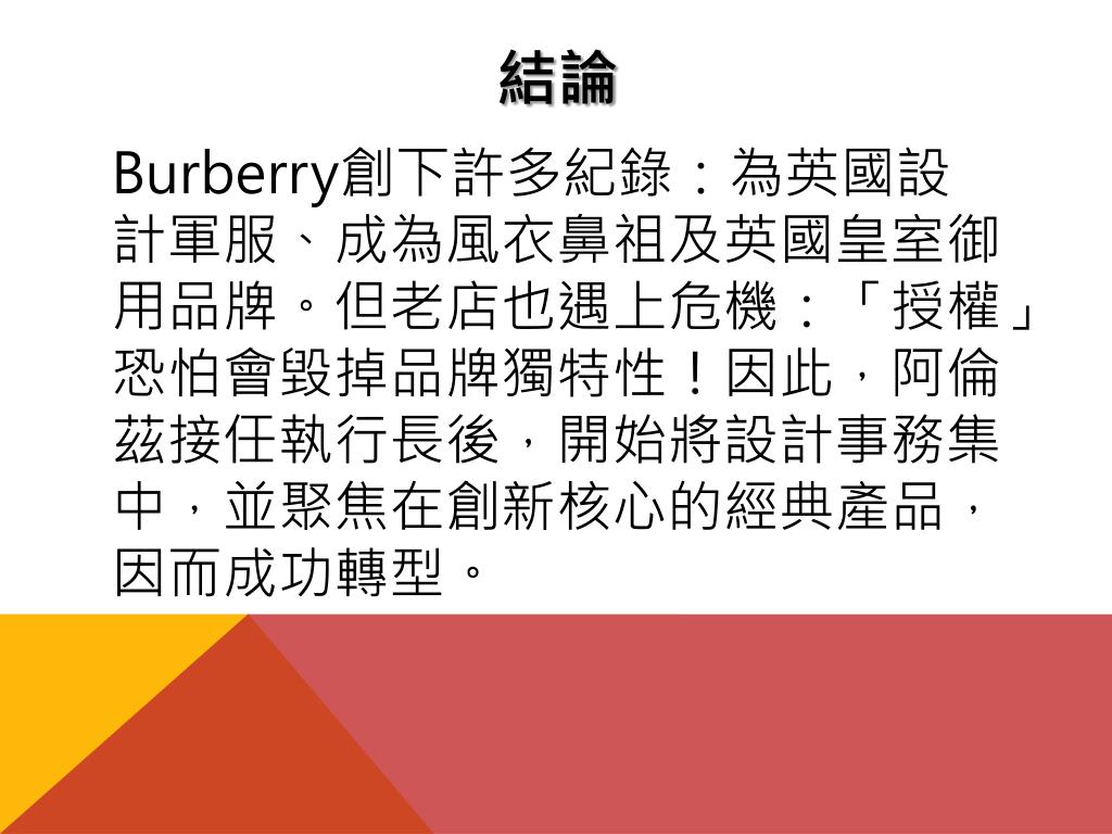 結論 • Burberry創下許多紀錄:為英國設計軍服、成為風衣鼻祖及英國皇室御用品牌。但老店也遇上危機:「授權」恐怕會毀掉品牌獨特性!因此,阿倫茲接任執行長後,開始將設計事務集中,並聚焦在創新核心的經典產品,因而成功轉型。