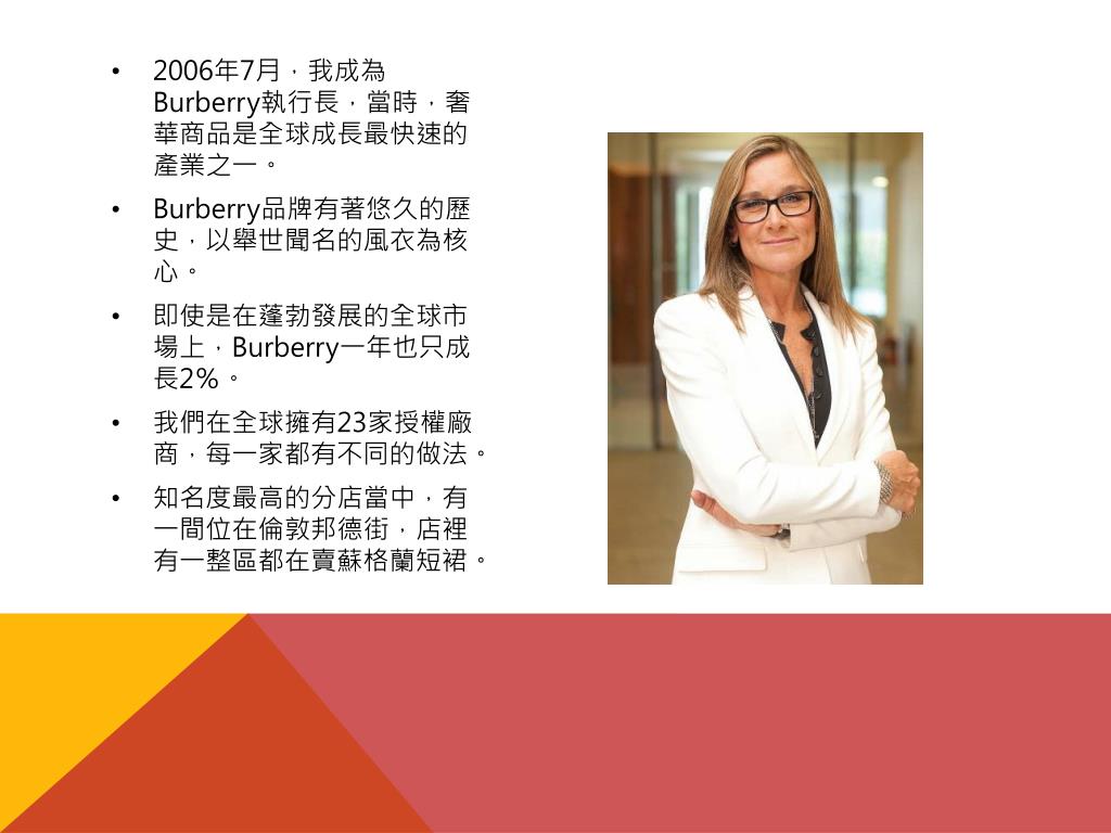 2006年7月,我成為Burberry執行長,當時,奢華商品是全球成長最快速的產業之一。2006年7月,我成為Burberry執行長,當時,奢華商品是全球成長最快速的產業之一。 • Burberry品牌有著悠久的歷史,以舉世聞名的風衣為核心。 • 即使是在蓬勃發展的全球市場上,Burberry一年也只成長2%。 • 我們在全球擁有23家授權廠商,每一家都有不同的做法。 • 知名度最高的分店當中,有一間位在倫敦邦德街,店裡有一整區都在賣蘇格蘭短裙。