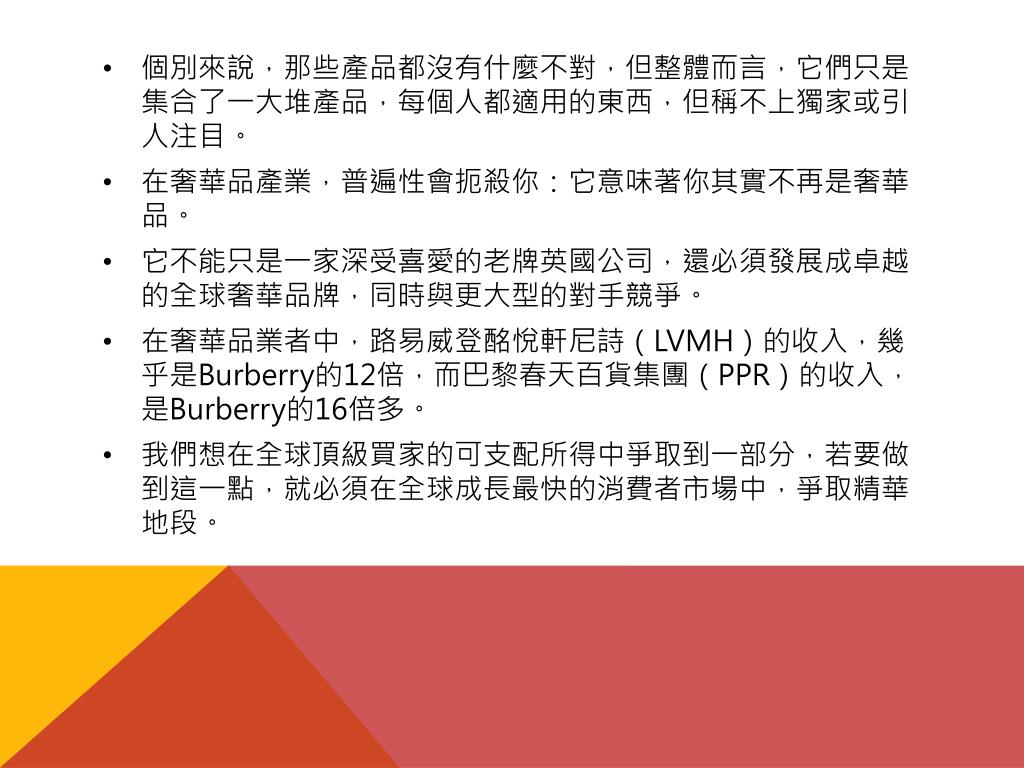 個別來說,那些產品都沒有什麼不對,但整體而言,它們只是集合了一大堆產品,每個人都適用的東西,但稱不上獨家或引人注目。個別來說,那些產品都沒有什麼不對,但整體而言,它們只是集合了一大堆產品,每個人都適用的東西,但稱不上獨家或引人注目。 • 在奢華品產業,普遍性會扼殺你:它意味著你其實不再是奢華品。 • 它不能只是一家深受喜愛的老牌英國公司,還必須發展成卓越的全球奢華品牌,同時與更大型的對手競爭。 • 在奢華品業者中,路易威登酩悅軒尼詩(LVMH)的收入,幾乎是Burberry的12倍,而巴黎春天百貨集團(PPR)的收入,是Burberry的16倍多。 • 我們想在全球頂級買家的可支配所得中爭取到一部分,若要做到這一點,就必須在全球成長最快的消費者市場中,爭取精華地段。