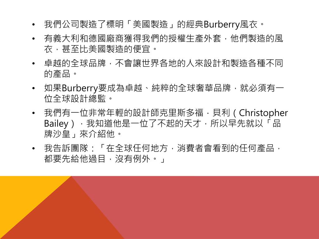 我們公司製造了標明「美國製造」的經典Burberry風衣。我們公司製造了標明「美國製造」的經典Burberry風衣。 • 有義大利和德國廠商獲得我們的授權生產外套,他們製造的風衣,甚至比美國製造的便宜。 • 卓越的全球品牌,不會讓世界各地的人來設計和製造各種不同的產品。 • 如果Burberry要成為卓越、純粹的全球奢華品牌,就必須有一位全球設計總監。 • 我們有一位非常年輕的設計師克里斯多福.貝利(Christopher Bailey),我知道他是一位了不起的天才,所以早先就以「品牌沙皇」來介紹他。 • 我告訴團隊:「在全球任何地方,消費者會看到的任何產品,都要先給他過目,沒有例外。」
