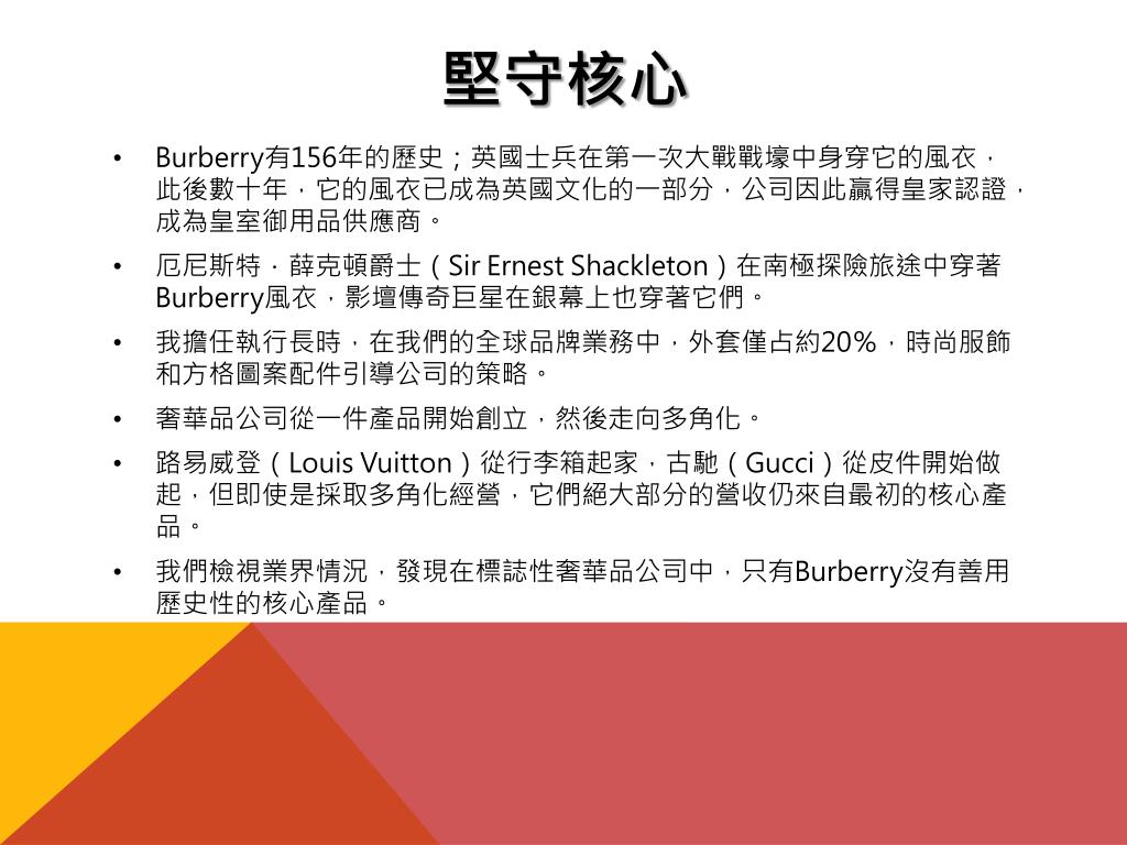 堅守核心 • Burberry有156年的歷史;英國士兵在第一次大戰戰壕中身穿它的風衣,此後數十年,它的風衣已成為英國文化的一部分,公司因此贏得皇家認證,成為皇室御用品供應商。 • 厄尼斯特.薛克頓爵士(Sir Ernest Shackleton)在南極探險旅途中穿著Burberry風衣,影壇傳奇巨星在銀幕上也穿著它們。 • 我擔任執行長時,在我們的全球品牌業務中,外套僅占約20%,時尚服飾和方格圖案配件引導公司的策略。 • 奢華品公司從一件產品開始創立,然後走向多角化。 • 路易威登(Louis Vuitton)從行李箱起家,古馳(Gucci)從皮件開始做起,但即使是採取多角化經營,它們絕大部分的營收仍來自最初的核心產品。 • 我們檢視業界情況,發現在標誌性奢華品公司中,只有Burberry沒有善用歷史性的核心產品。