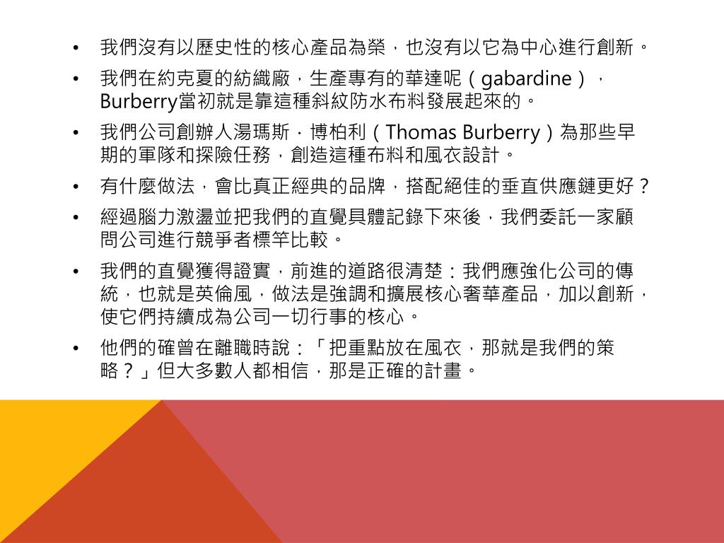 我們沒有以歷史性的核心產品為榮,也沒有以它為中心進行創新。我們沒有以歷史性的核心產品為榮,也沒有以它為中心進行創新。 • 我們在約克夏的紡織廠,生產專有的華達呢(gabardine),Burberry當初就是靠這種斜紋防水布料發展起來的。 • 我們公司創辦人湯瑪斯.博柏利(Thomas Burberry)為那些早期的軍隊和探險任務,創造這種布料和風衣設計。 • 有什麼做法,會比真正經典的品牌,搭配絕佳的垂直供應鏈更好? • 經過腦力激盪並把我們的直覺具體記錄下來後,我們委託一家顧問公司進行競爭者標竿比較。 • 我們的直覺獲得證實,前進的道路很清楚:我們應強化公司的傳統,也就是英倫風,做法是強調和擴展核心奢華產品,加以創新,使它們持續成為公司一切行事的核心。 • 他們的確曾在離職時說:「把重點放在風衣,那就是我們的策略?」但大多數人都相信,那是正確的計畫。