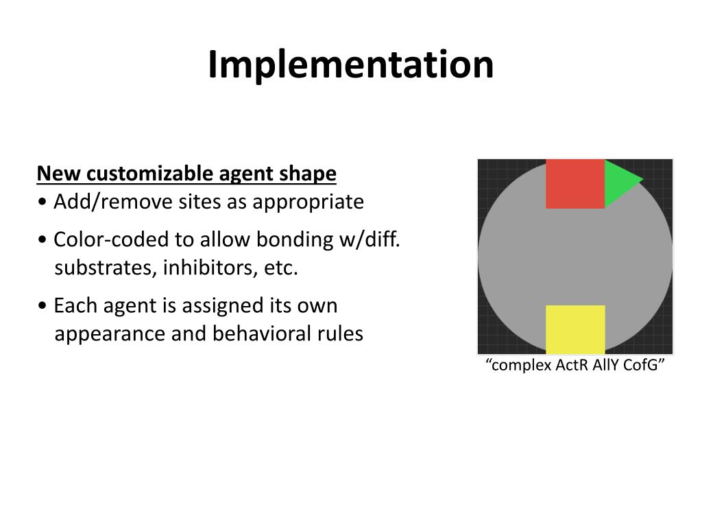 Implementation New customizable agent shape • Add/remove sites as appropriate • Color-coded to allow bonding w/diff. substrates, inhibitors, etc. • Each agent is assigned its own appearance and behavioral rules “complex ActR AllY CofG”