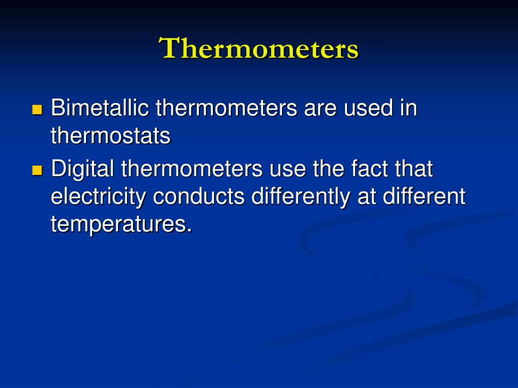 Thermometers • Bimetallic thermometers are used in thermostats • Digital thermometers use the fact that electricity conducts differently at different temperatures.