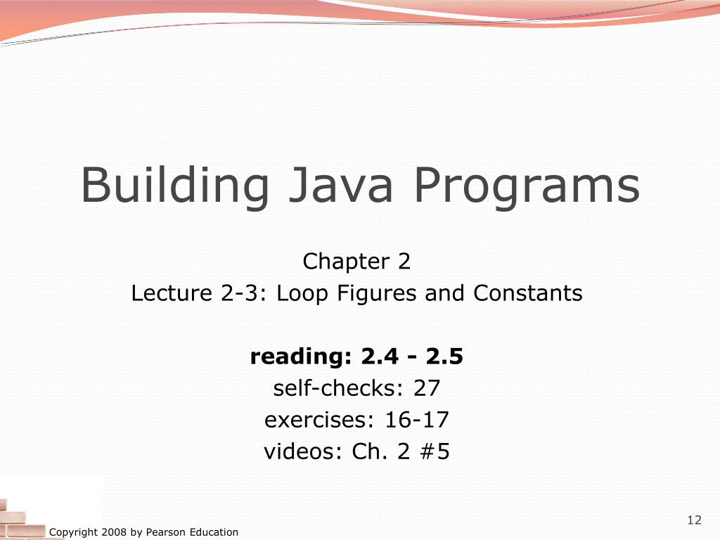 Building Java Programs Chapter 2 Lecture 2-3: Loop Figures and Constants reading: 2.4 - 2.5 self-checks: 27 exercises: 16-17 videos: Ch. 2 #5