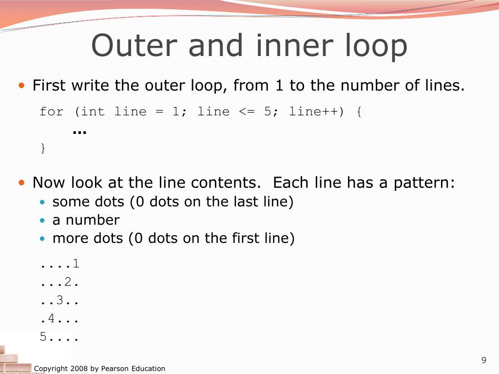 Outer and inner loop First write the outer loop, from 1 to the number of lines. for (int line = 1; line <= 5; line++) { ... } Now look at the line contents. Each line has a pattern: some dots (0 dots on the last line) a number more dots (0 dots on the first line) ....1 ...2. ..3.. .4... 5....