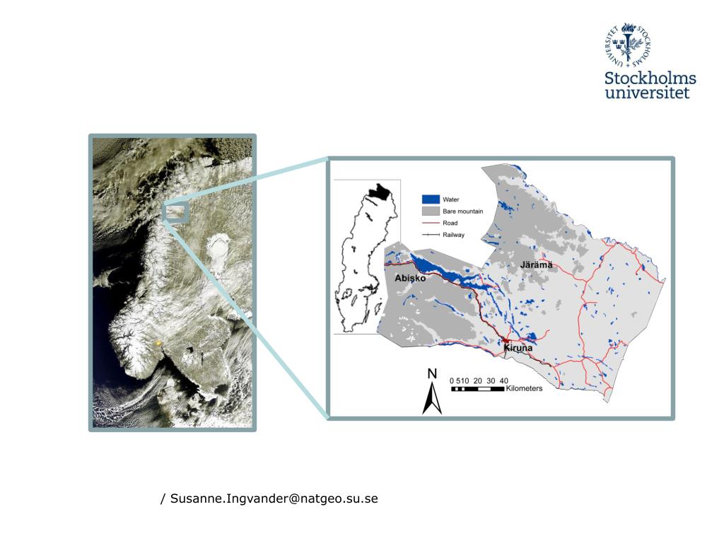 Viktiga faktorer för snöackumulationsmöster i svenska fjällen Satellitdatats egenskaper: -Upplösning -Instrument -Överflygningstäthet -Tillgänglighet av data Instrålningsmängd och vinkel Huvudvindriktning och omdistibution av snö Metrologiska parametrar Ackumulation i vegetation Vind och läsida av topografi i omgivningen Typ av underlag / Susanne.Ingvander@natgeo.su.se