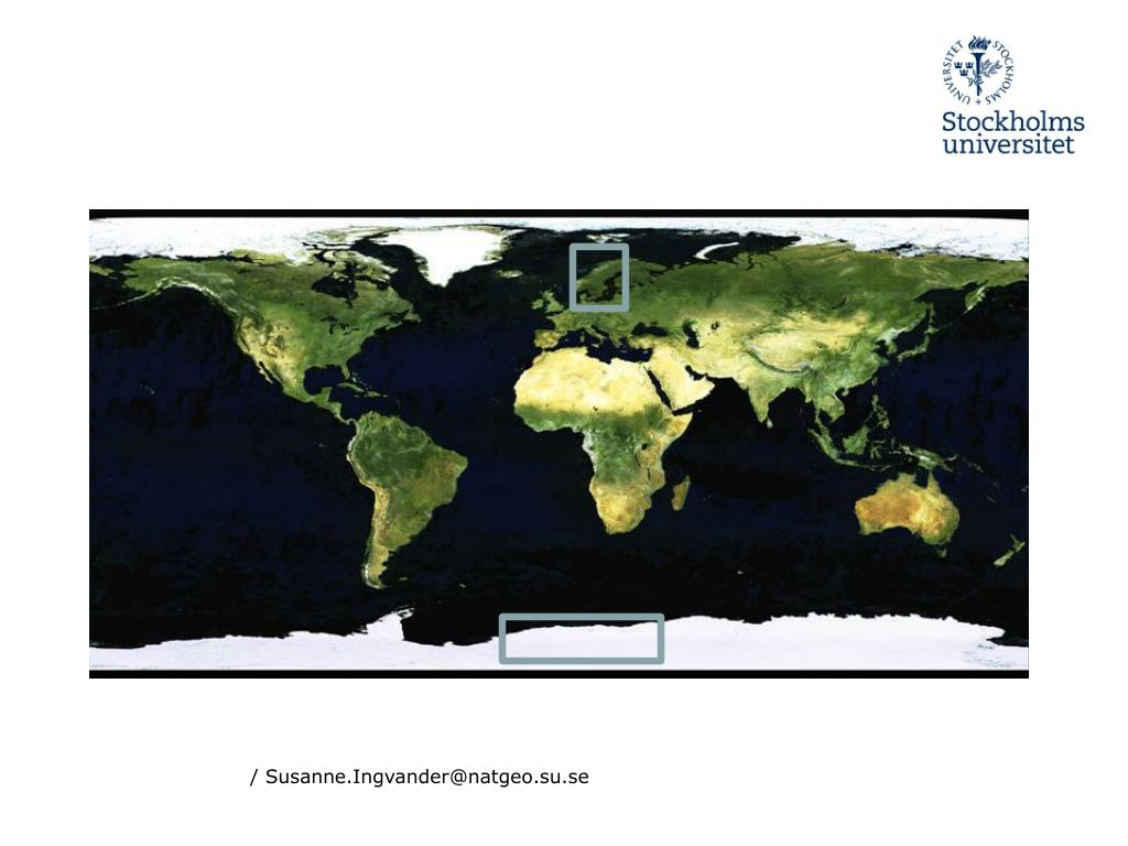 Satellitdata: • Radar & optiska bilder för rumslig kartering och kartering över tid. • Fältmätningar av • snöpacken över tid och • rum. Validering av satellitdata. • Förbättra nogrannhet i • satellitalgoritmer och • modeller. / Susanne.Ingvander@natgeo.su.se www.newint.org/features/2009/07/01/arctic-climate/ www.nasa.gov - Antarctica Mosaic - Terra 4km True Color 2009/315 (11/11/09)