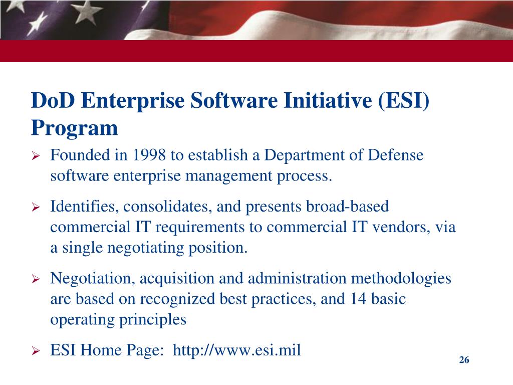 DoD Enterprise Software Initiative (ESI) Program • Founded in 1998 to establish a Department of Defense software enterprise management process. • Identifies, consolidates, and presents broad-based commercial IT requirements to commercial IT vendors, via a single negotiating position. • Negotiation, acquisition and administration methodologies are based on recognized best practices, and 14 basic operating principles • ESI Home Page: http://www.esi.mil