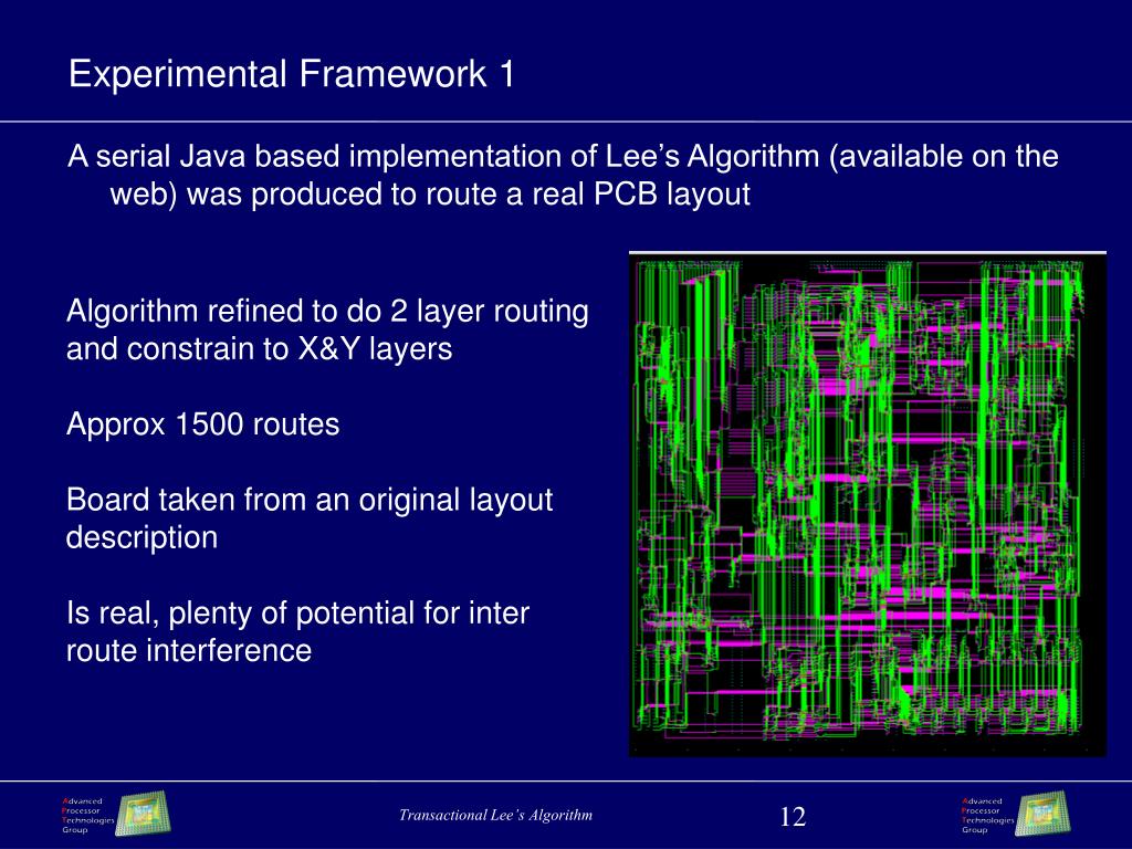 Experimental Framework 1 • A serial Java based implementation of Lee’s Algorithm (available on the web) was produced to route a real PCB layout Algorithm refined to do 2 layer routing and constrain to X&Y layers Approx 1500 routes Board taken from an original layout description Is real, plenty of potential for inter route interference