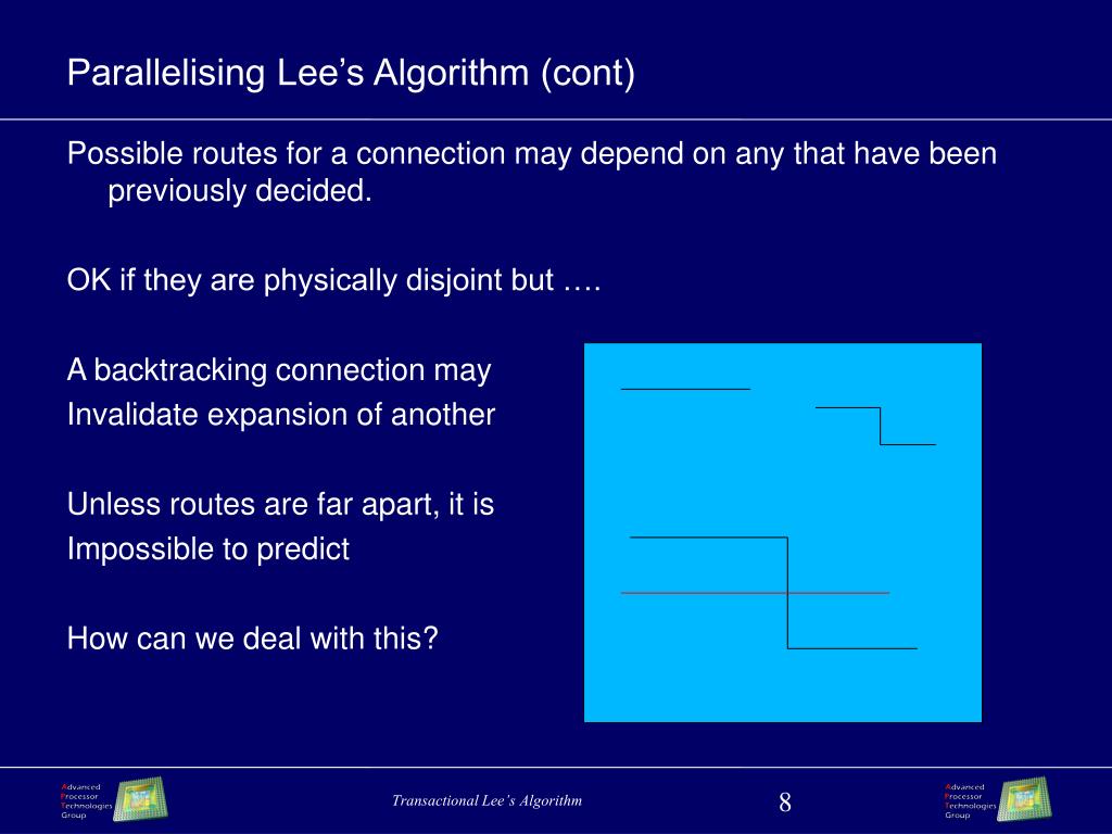 Parallelising Lee’s Algorithm (cont) • Possible routes for a connection may depend on any that have been previously decided. • OK if they are physically disjoint but …. • A backtracking connection may • Invalidate expansion of another • Unless routes are far apart, it is • Impossible to predict • How can we deal with this?