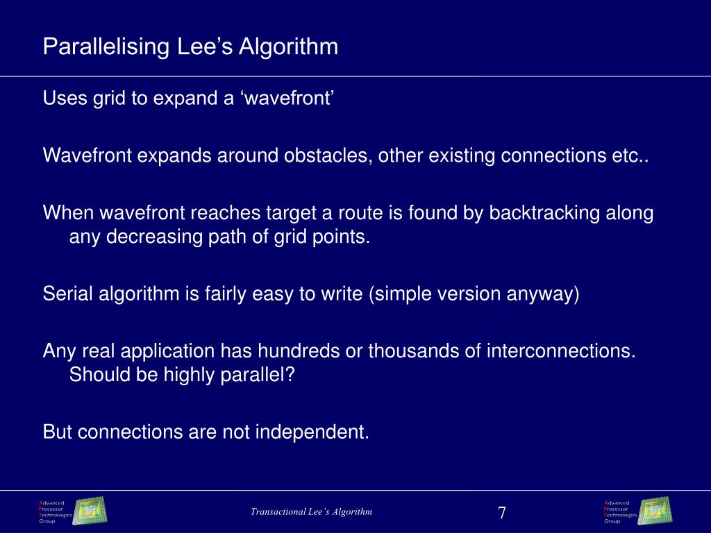 Parallelising Lee’s Algorithm • Uses grid to expand a ‘wavefront’ • Wavefront expands around obstacles, other existing connections etc.. • When wavefront reaches target a route is found by backtracking along any decreasing path of grid points. • Serial algorithm is fairly easy to write (simple version anyway) • Any real application has hundreds or thousands of interconnections. Should be highly parallel? • But connections are not independent.