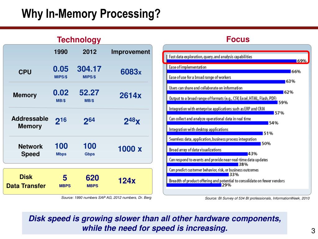 Why In-Memory Processing? Focus Technology 1990 2012 Improvement 0.05 MIPS/$ 304.17 MIPS/$ 6083x CPU 0.02 MB/$ 52.27 MB/$ 2614x Memory 216 264 248x Addressable Memory 100 Mbps 100 Gbps 1000 x Network Speed 5 MBPS 620 MBPS 124x Disk Data Transfer Source: 1990 numbers SAP AG, 2012 numbers, Dr. Berg Source: BI Survey of 534 BI professionals, InformationWeek, 2010 Disk speed is growing slower than all other hardware components, while the need for speed is increasing.