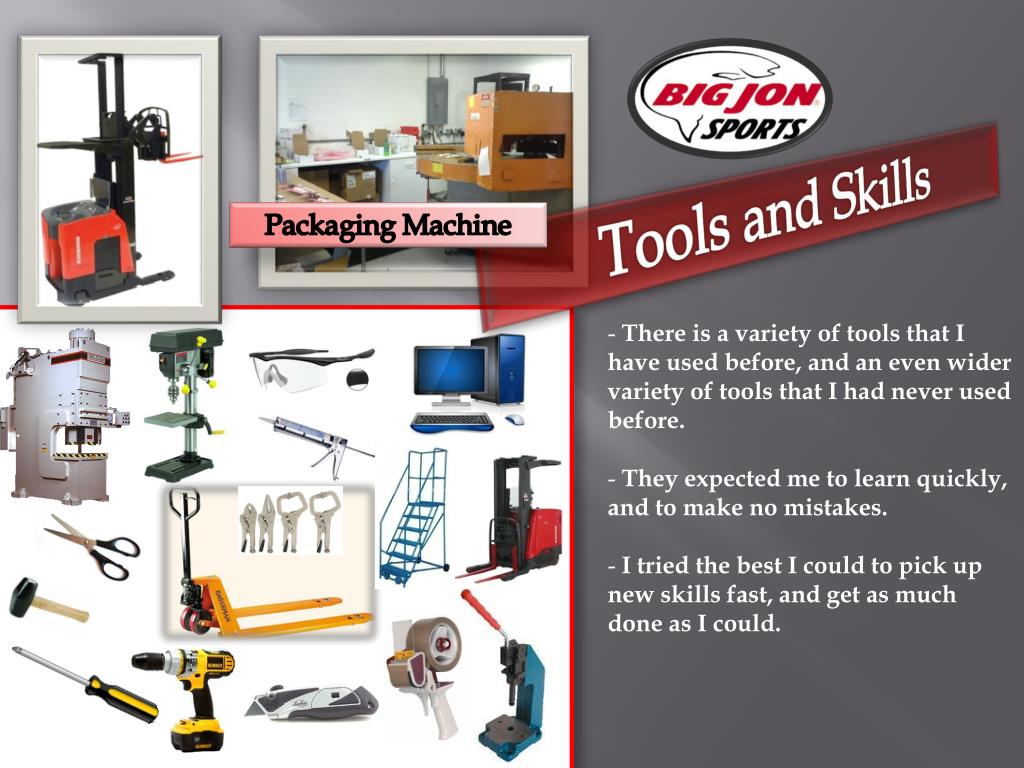 Tools and Skills Packaging Machine • There is a variety of tools that I have used before, and an even wider variety of tools that I had never used before. • They expected me to learn quickly, and to make no mistakes. • I tried the best I could to pick up new skills fast, and get as much done as I could.