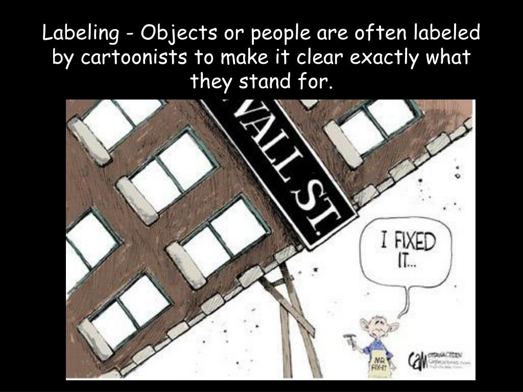 Labeling - Objects or people are often labeled by cartoonists to make it clear exactly what they stand for.