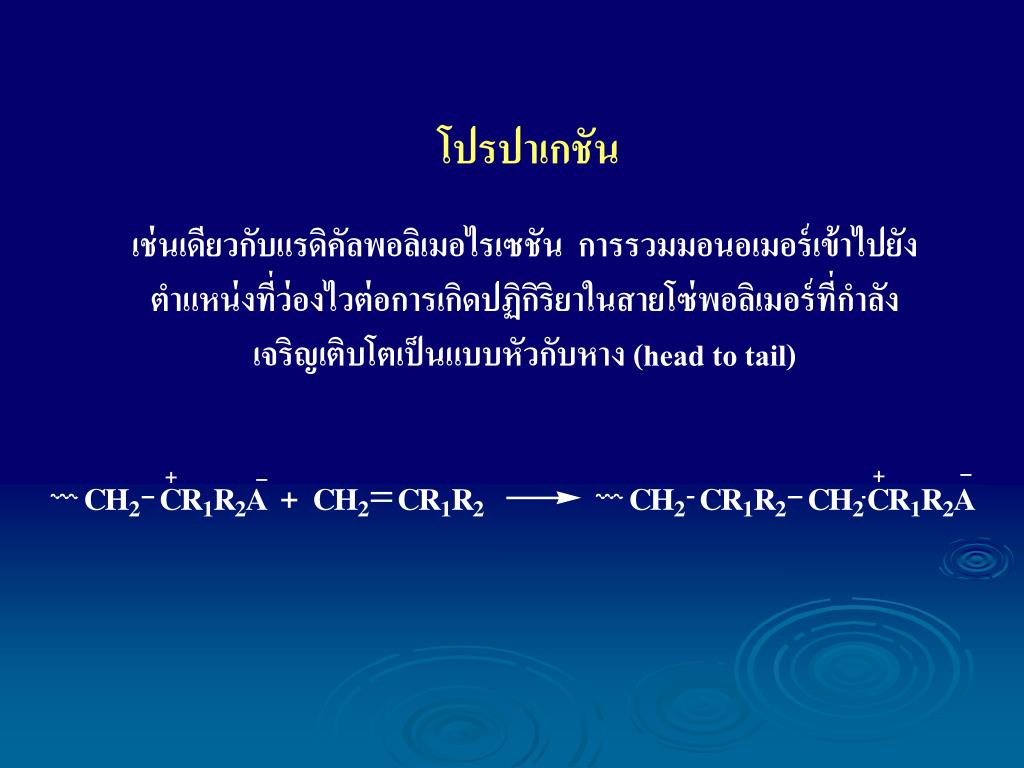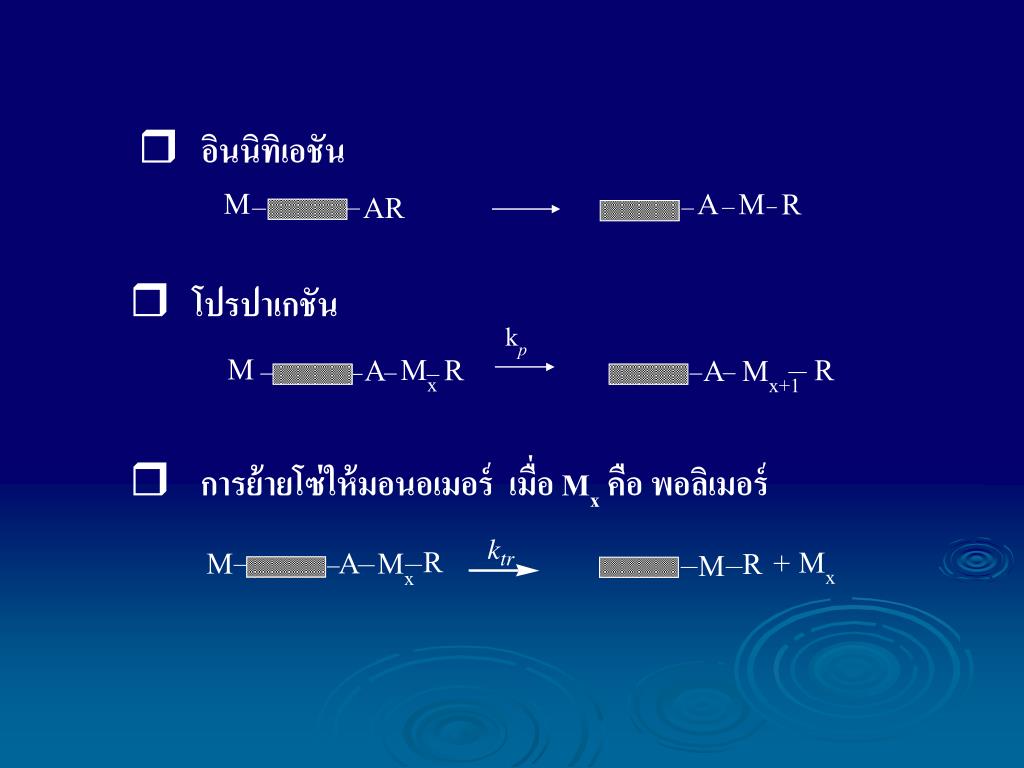 kp • อินนิทิเอชัน M A M R AR • โปรปาเกชัน M Mx R R A A Mx+1 • การย้ายโซ่ให้มอนอเมอร์ เมื่อ Mx คือ พอลิเมอร์ R Mx A + M Mx R M