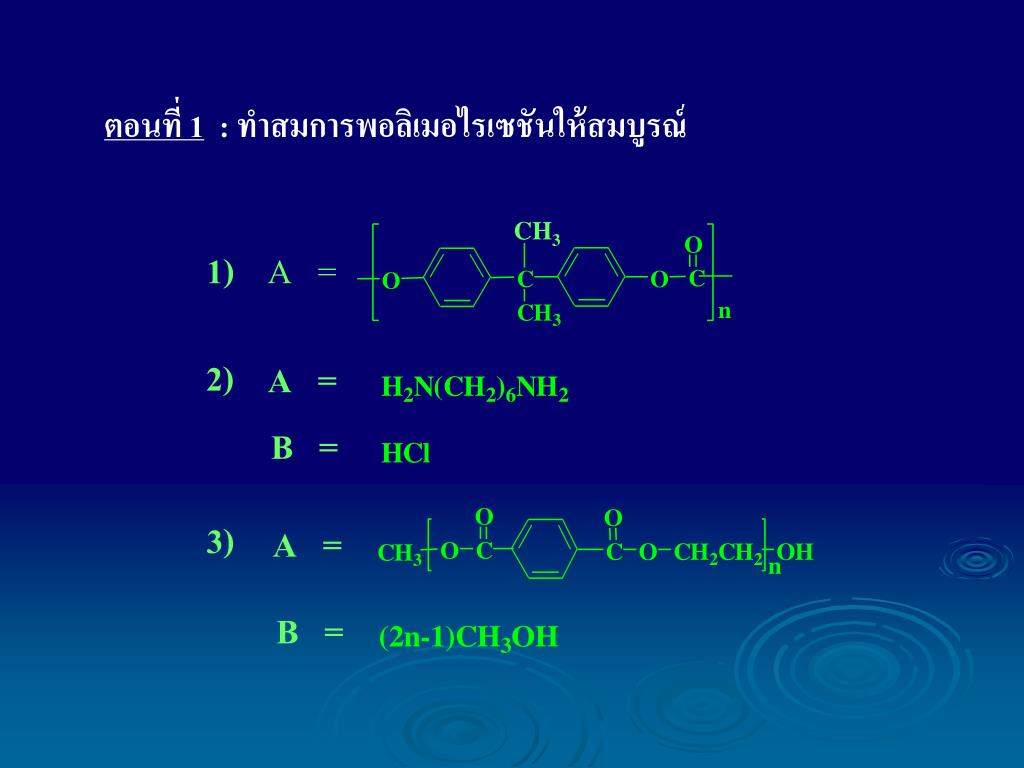 A + 1) Polycarbonate (PC) n A 2) + B + (2n-1) Polyamide ตอนที่ 1 : ทำสมการพอลิเมอไรเซชันต่อไปนี้ให้สมบูรณ์