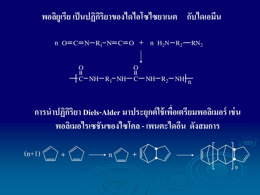 + n n (n+1) n + + พอลิยูเรีย เป็นปฏิกิริยาของไดไอโซไซยาเนต กับไดเอมีน การนำปฏิกิริยา Diels-Alder มาประยุกต์ใช้เพื่อเตรียมพอลิเมอร์ เช่น พอลิเมอไรเซชันของไซโคล - เพนตะไดอีน ดังสมการ
