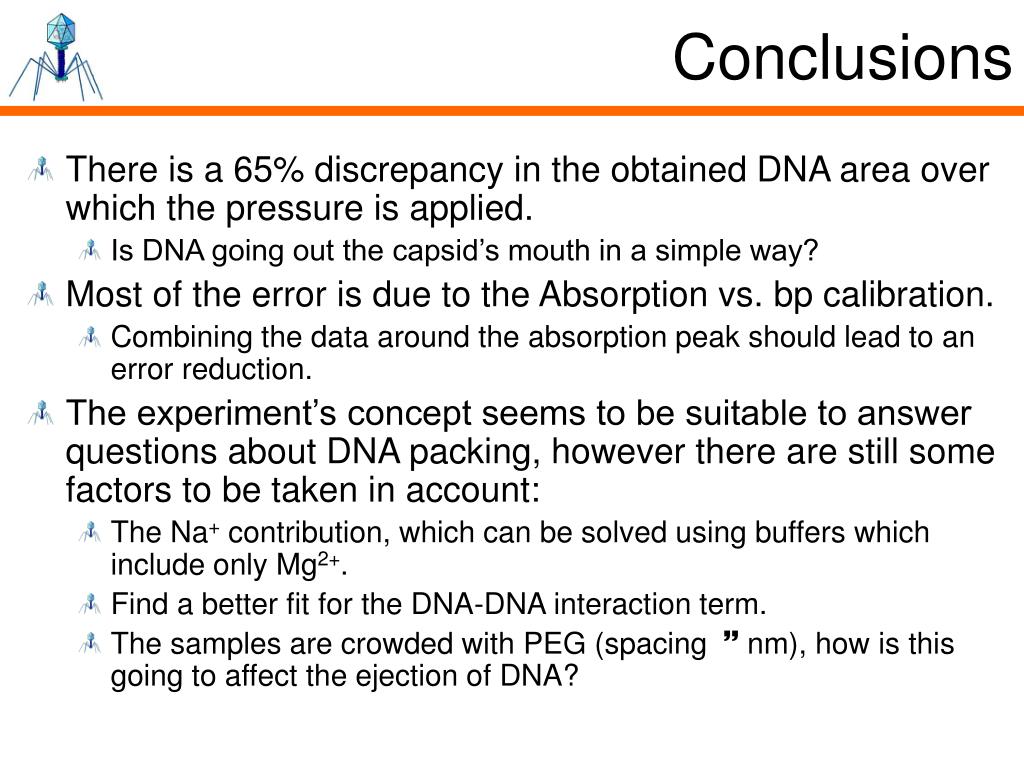 Conclusions • There is a 65% discrepancy in the obtained DNA area over which the pressure is applied. • Is DNA going out the capsid’s mouth in a simple way? • Most of the error is due to the Absorption vs. bp calibration. • Combining the data around the absorption peak should lead to an error reduction. • The experiment’s concept seems to be suitable to answer questions about DNA packing, however there are still some factors to be taken in account: • The Na+ contribution, which can be solved using buffers which include only Mg2+. • Find a better fit for the DNA-DNA interaction term. • The samples are crowded with PEG (spacing nm), how is this going to affect the ejection of DNA?