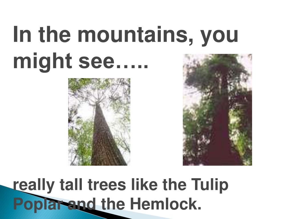 In the mountains, you might see….. really tall trees like the Tulip Poplar and the Hemlock.