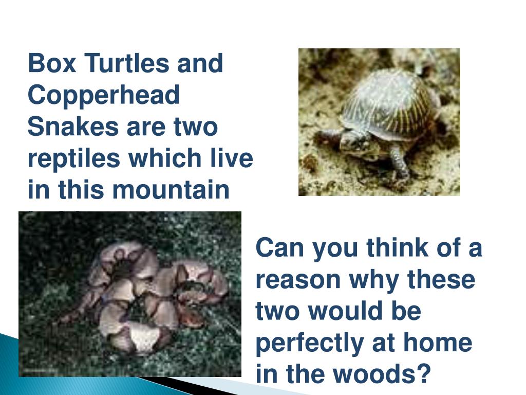 Box Turtles and Copperhead Snakes are two reptiles which live in this mountain habitat. Can you think of a reason why these two would be perfectly at home in the woods?