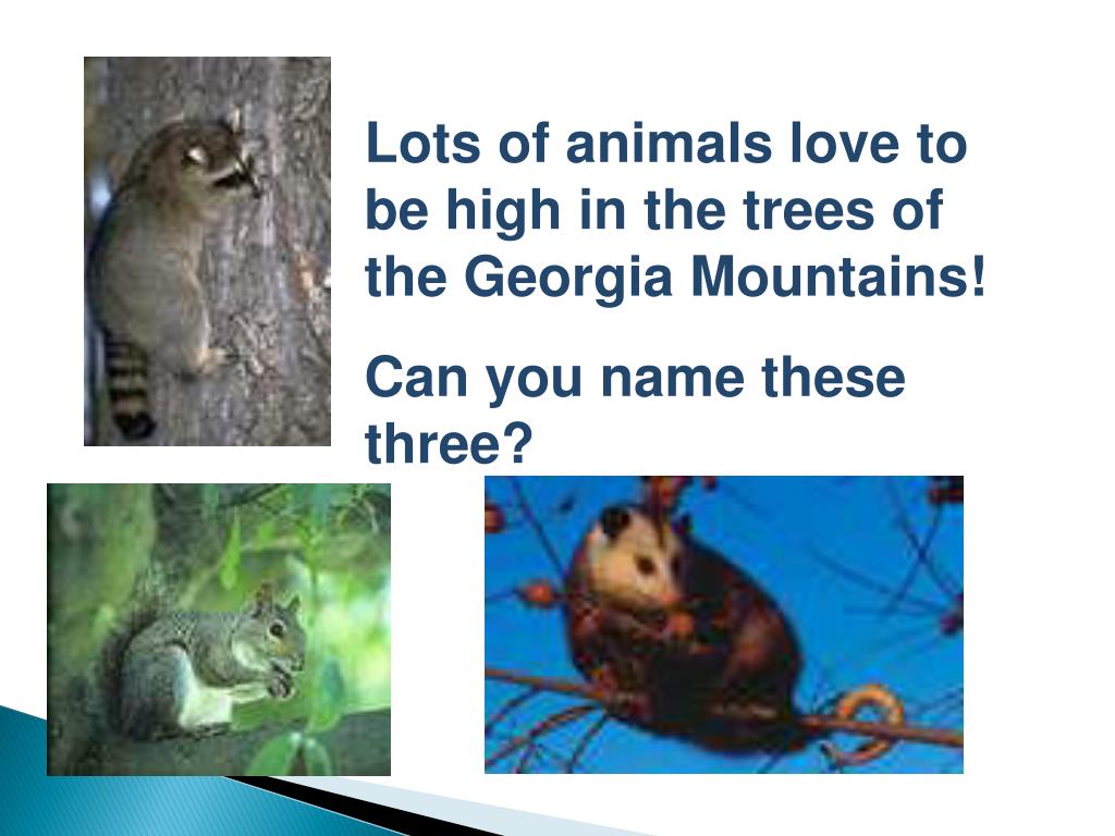 Lots of animals love to be high in the trees of the Georgia Mountains! Can you name these three?