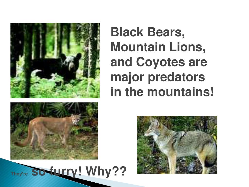 Black Bears, Mountain Lions, and Coyotes are major predators in the mountains! They’re so furry! Why??