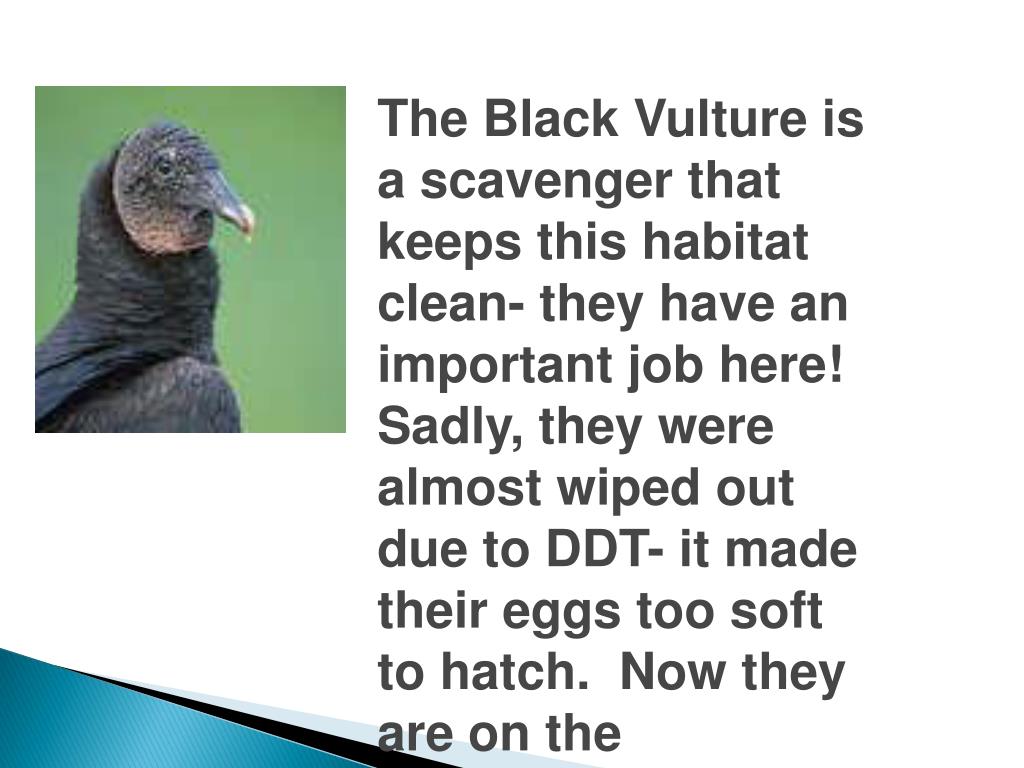 The Black Vulture is a scavenger that keeps this habitat clean- they have an important job here! Sadly, they were almost wiped out due to DDT- it made their eggs too soft to hatch. Now they are on the Threatened List, so they are making a comeback.