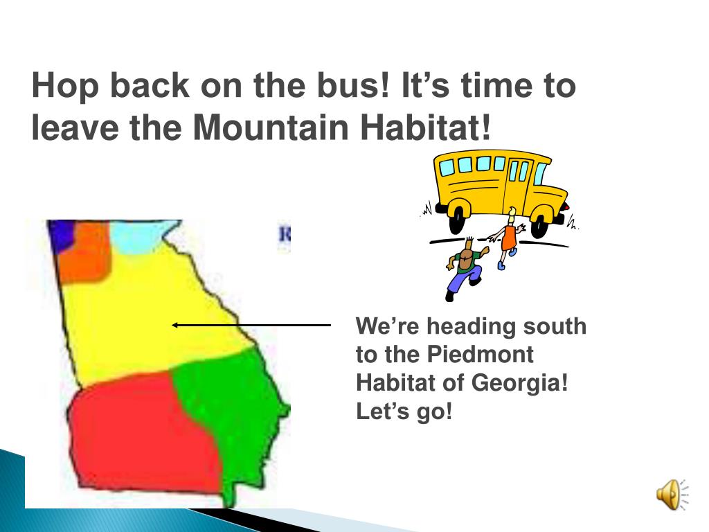 Hop back on the bus! It’s time to leave the Mountain Habitat! We’re heading south to the Piedmont Habitat of Georgia! Let’s go!