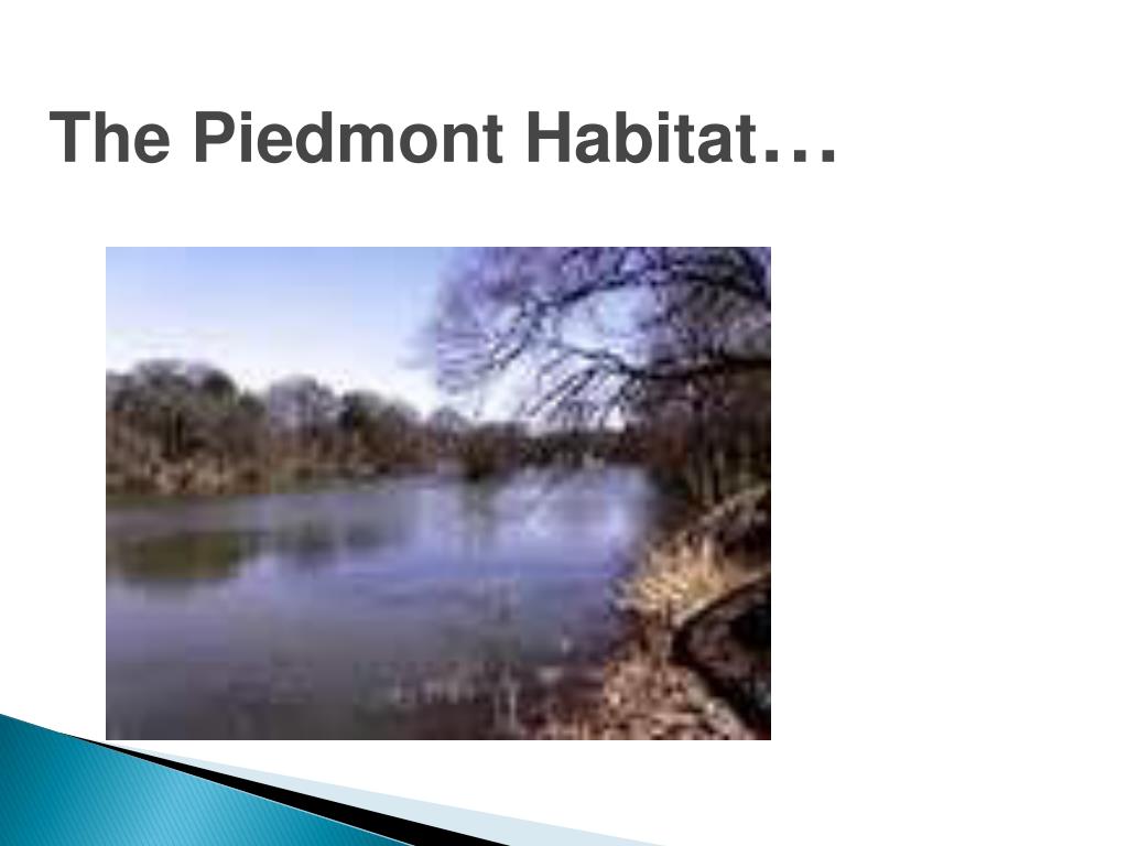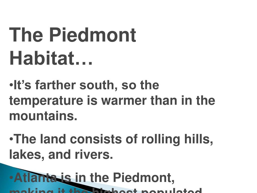 The Piedmont Habitat… • It’s farther south, so the temperature is warmer than in the mountains. • The land consists of rolling hills, lakes, and rivers. • Atlanta is in the Piedmont, making it the highest populated region of Georgia. Why do so many people like this region?
