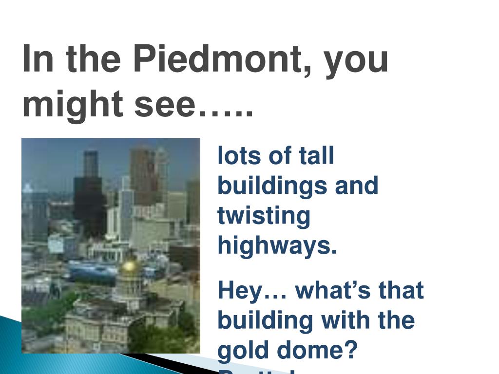 In the Piedmont, you might see….. lots of tall buildings and twisting highways. Hey… what’s that building with the gold dome? Pretty!